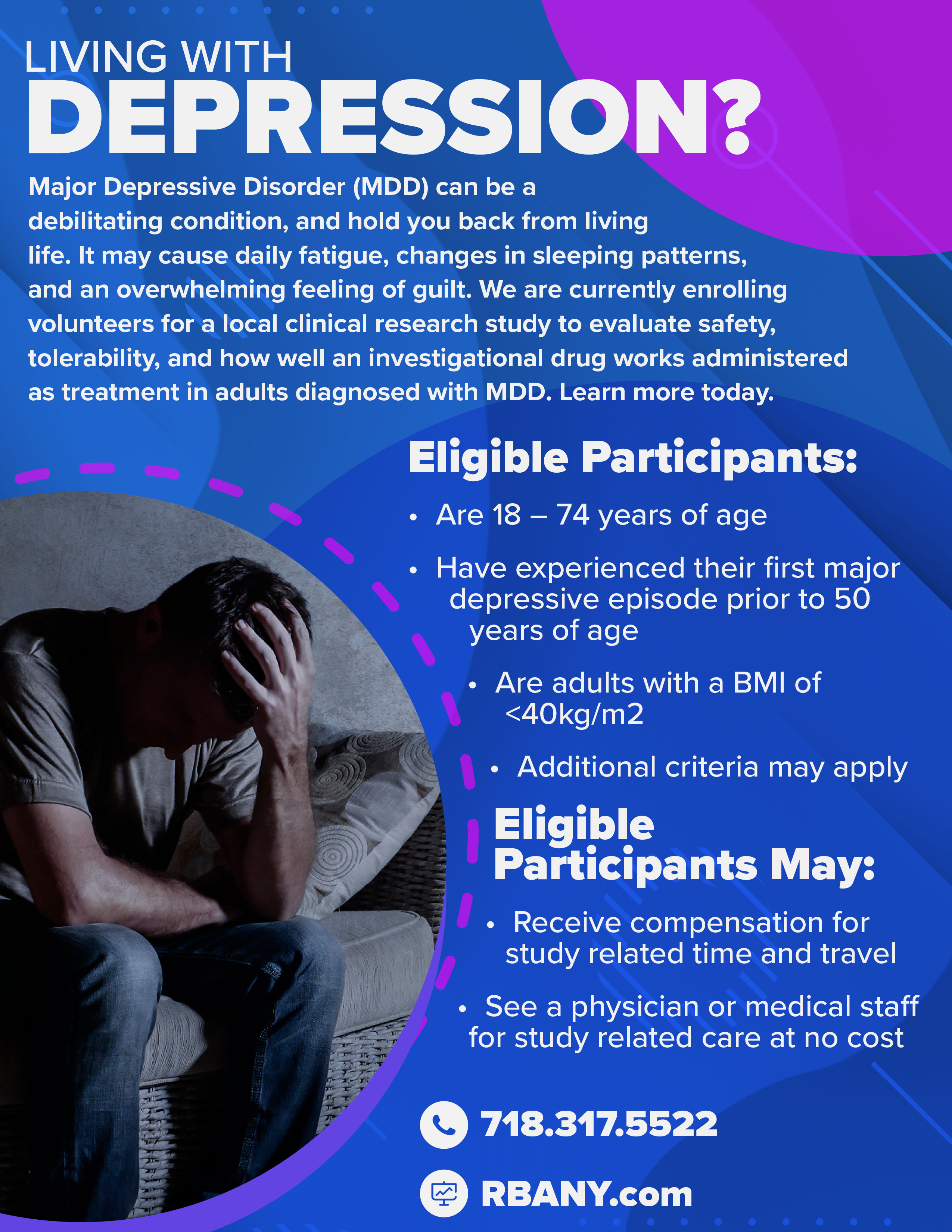 Living With Depression? Major Depressive Disorder (MDD) can be a debilitating condition, and hold you back from living life. It may cause daily fatigue, changes in sleeping patterns, and an overwhelming feeling of guilt. We are currently enrolling volunteers for a local clinical research study to evaluate safety, tolerability, and how well an investigational drug works administered as treatment in adults diagnosed with MDD. Learn more today. Eligible Participants: Are 18 – 74 years of age Have experienced their first major depressive episode prior to 50 years of age Are adults with a BMI of <40kg/m2 Additional criteria may apply Eligible Participants May: Receive compensation for study related time and travel See a physician or medical staff for study related care at no cost |