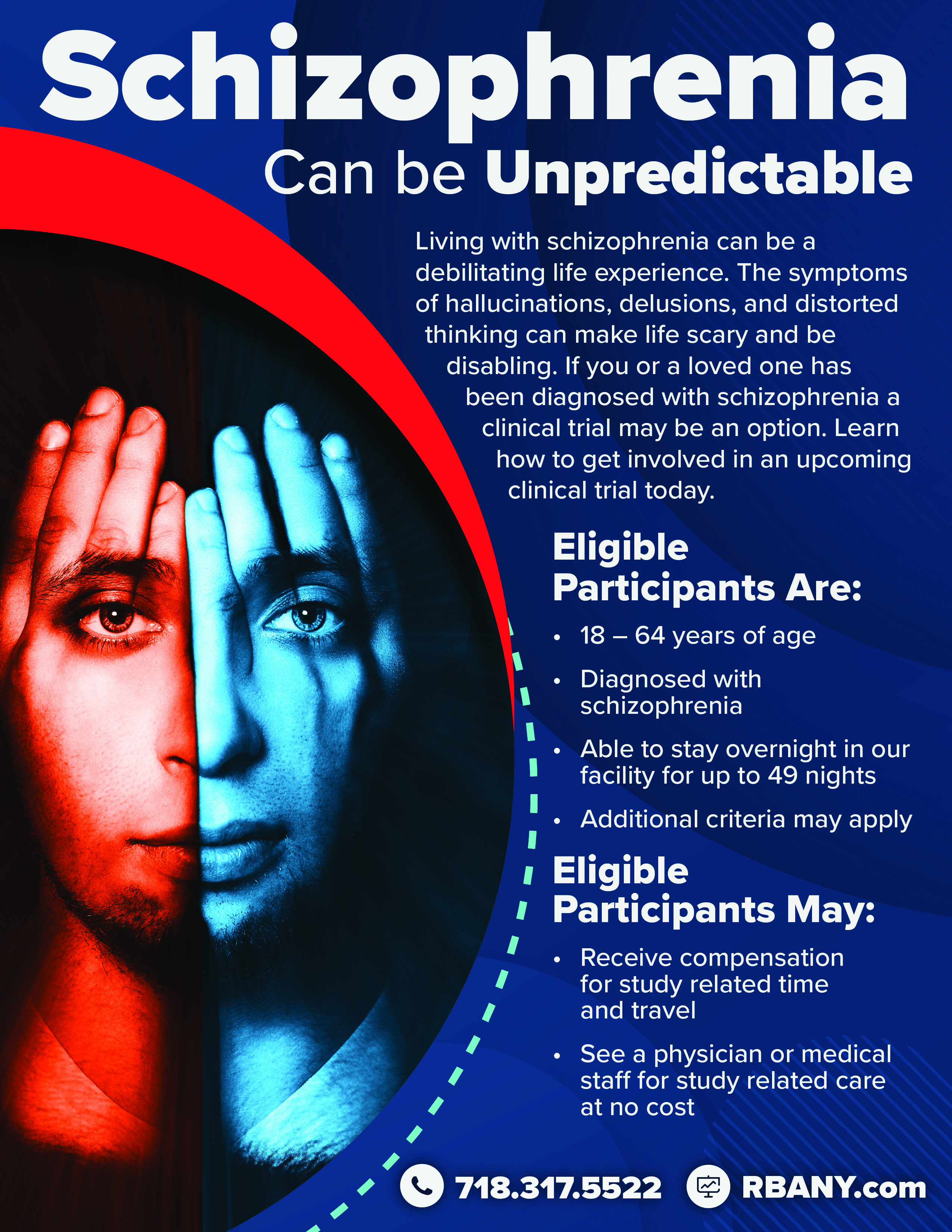 Living with schizophrenia can be a debilitating life experience. The symptoms of hallucinations, delusions, and distorted thinking can make life scary and be disabling. If you or a loved one has been diagnosed with schizophrenia a clinical trial may be an option. Learn how to get involved in an upcoming clinical trial today. Eligible Participants Are: